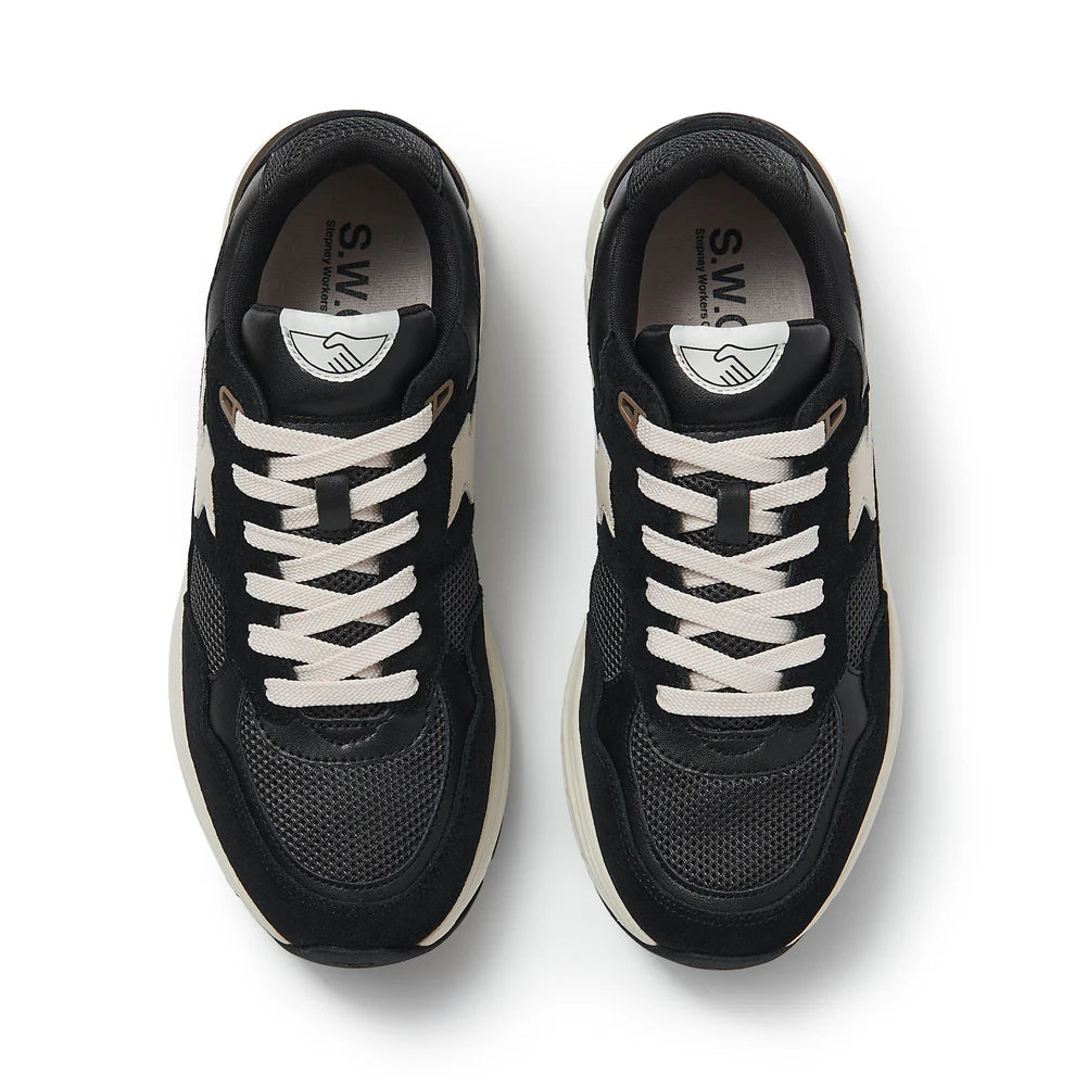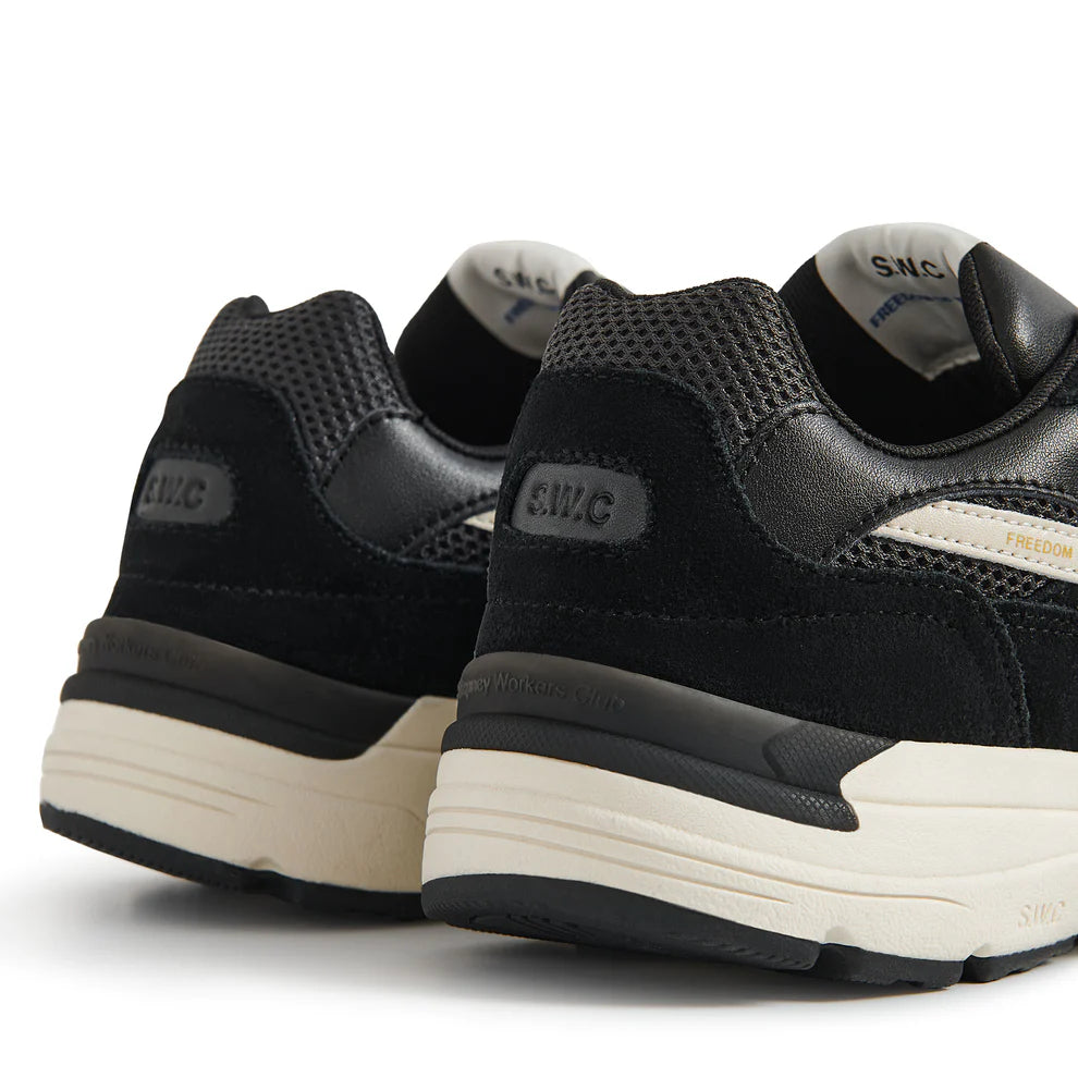 Der Amiel S-Strike ist unsere Interpretation einer zeitlosen Laufschuh-Silhouette aus den 90ern. Er ist mit einem Obermaterial aus leichtem schwarzem Wildleder, einem farblich abgestimmten Vorderteil aus schwarzem Sport-Mesh und einem S-Strike aus ecrufarbenem Leder ausgestattet. Die Sohle besteht aus einer komplexen, dreiteiligen, leichten Konstruktion mit einer gepolsterten EVA-Zwischensohle mit geringer Dichte, einer Stollensohle mit „Insel“-Sohle und einer S-Strike TPU-Fersenstütze für Stabilität. Diese Konstruktion sorgt für einen bequemen und leichten Laufschuh für den täglichen Gebrauch.