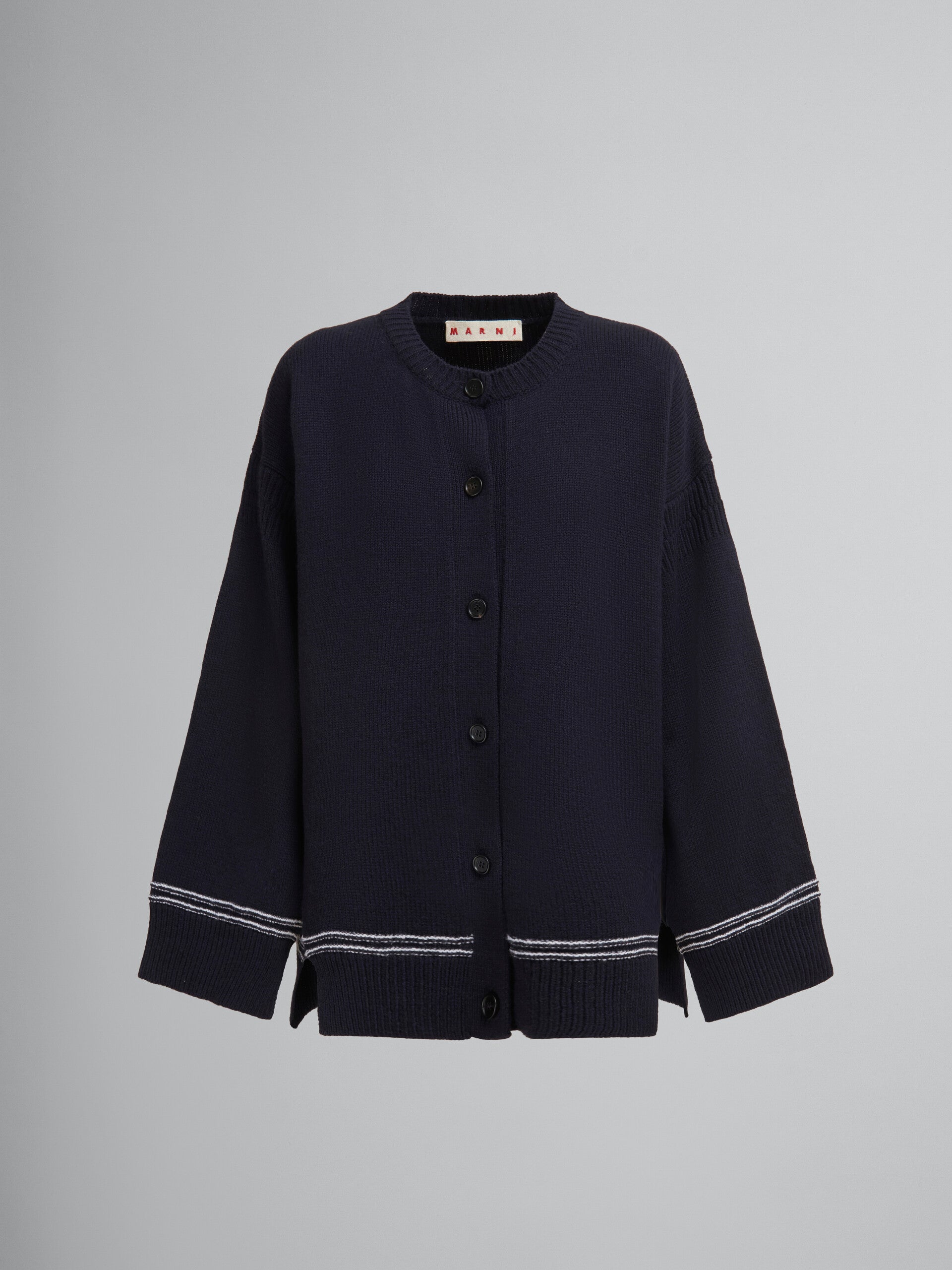 Wollcardigan, Rundhalsausschnitt, Knopfverschluss vorne, Intarsien hinten mit kontrastfarbenem Logo, seitliche Schlitze, lange Ärmel mit Bündchen und Kontrastnähte.