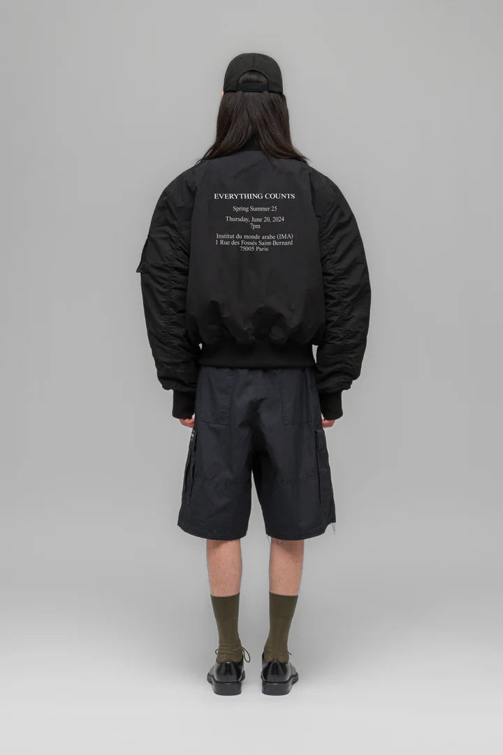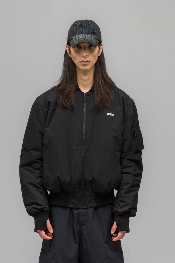 Unsere kultige Bomberjacke mit lockerer Passform und durchgehendem Reißverschluss, Leistentaschen am Körper und einer aufgesetzten Ärmeltasche. Baumwollrippen an Kragen und Ärmelbündchen. Gepolstert und vollständig mit fließender Viskose gefüttert. Ein 032c-Metall-Reißverschluss an der Ärmeltasche und ein Daumenloch an der Ärmelrippe halten die Hände warm. Ein charakteristischer, zeitloser Stil.