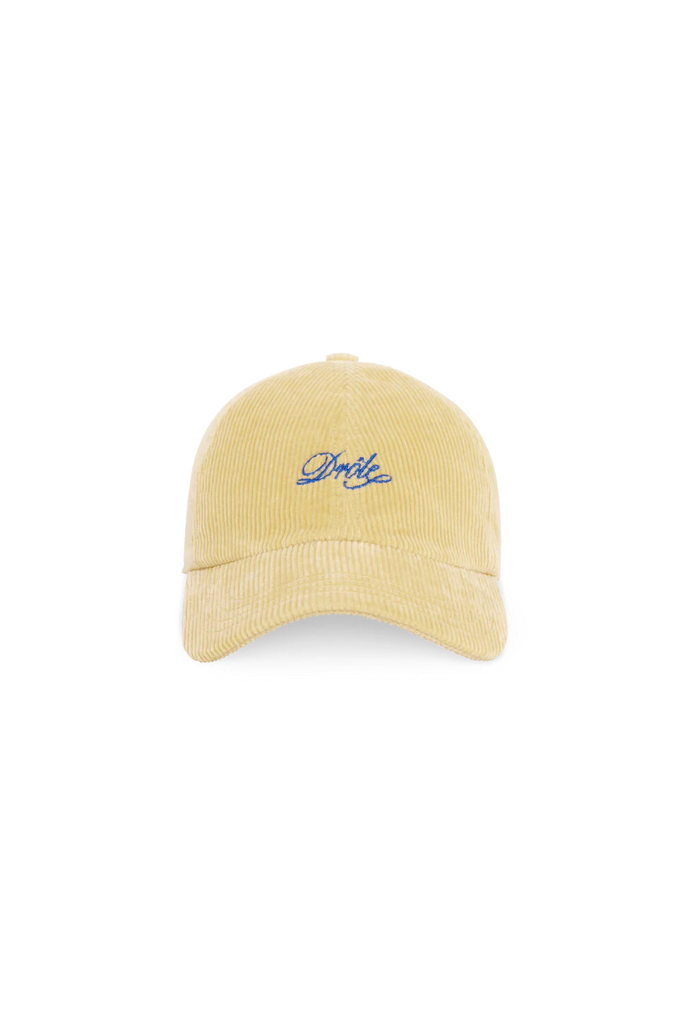 Diese gelbe 6-Panel-Baseballmütze aus Kord hat eine geflochtene Metallschnalle und einen verstellbaren Riemen. Auf der Vorderseite ist der Schriftzug „Drôle“ eingestickt.