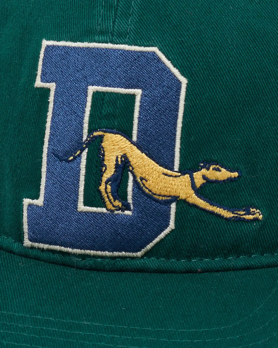 Diese dunkelgrüne 6-Panel-Baseballmütze aus 100 % Baumwolle hat ein flaches Visier, einen verstellbaren Riemen und eine gravierte „Drôle“-Metallschnalle. Auf der Vorderseite befindet sich eine Stickerei von Drôle Sport.