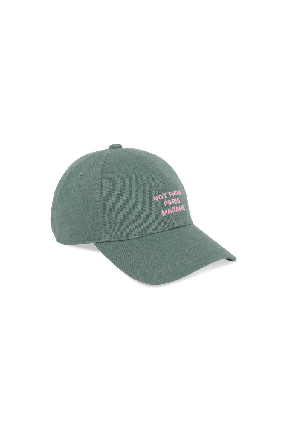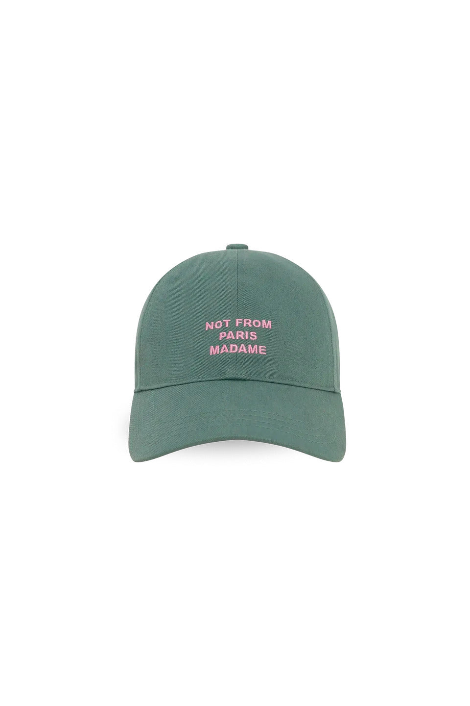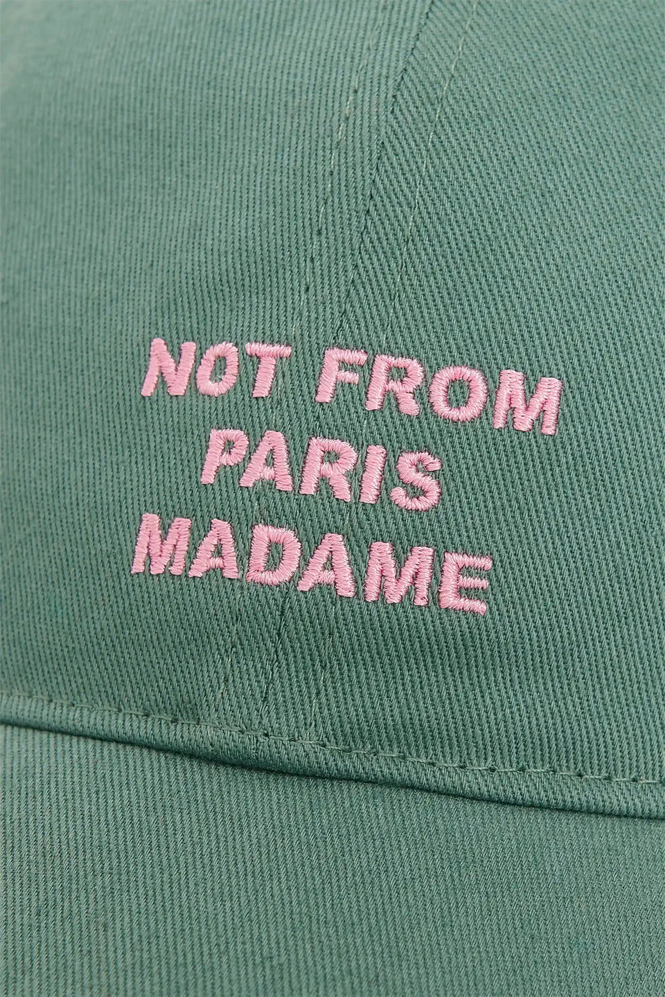 Diese wassergrüne 6-Panel-Baseballmütze aus 100 % Baumwolle hat eine eingravierte „Drôle“-Metallschnalle und ein verstellbares Band. Auf der Vorderseite ist der Slogan „Not from Paris Madame“ aufgestickt.