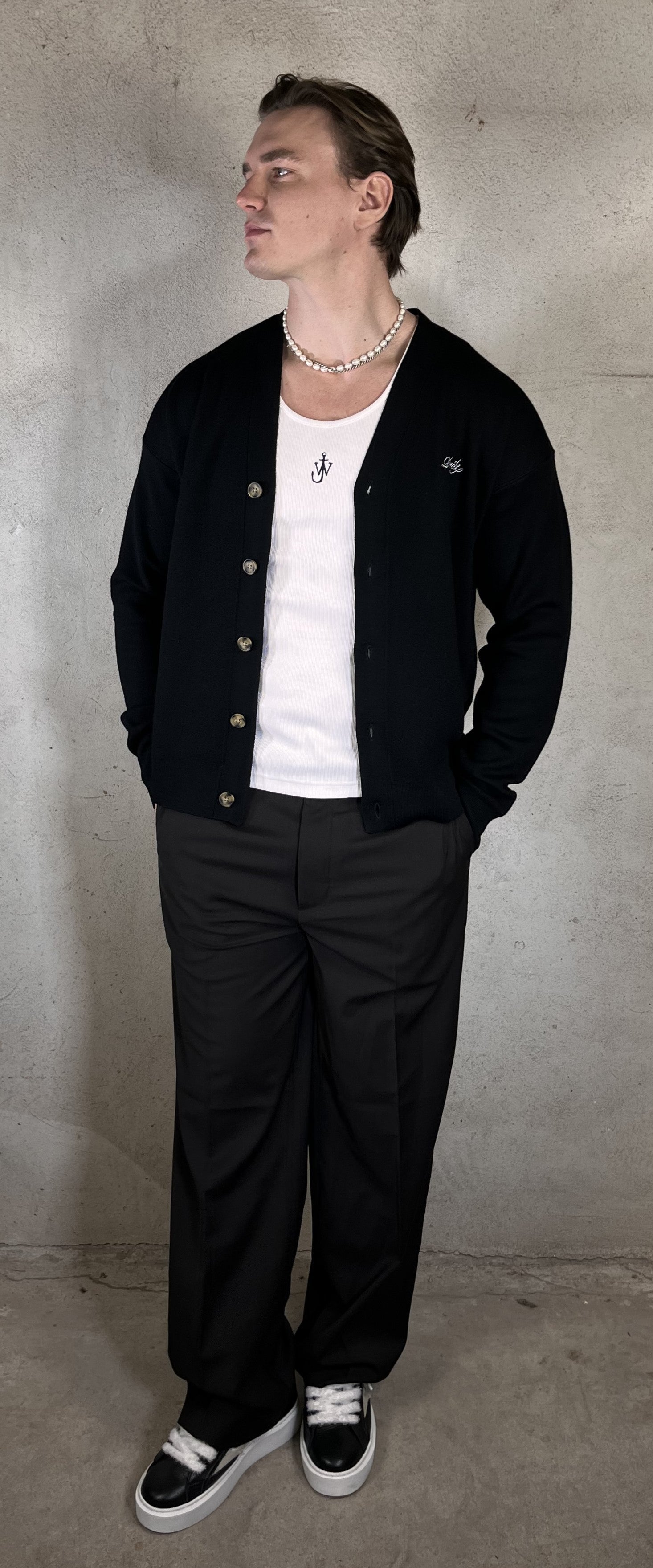 Diese schwarze Strickjacke aus 100% Wolle ist mit einer „Drôle“-Stickerei auf der Brust, gerippten Kanten und fünf Knöpfen auf der Vorderseite versehen.