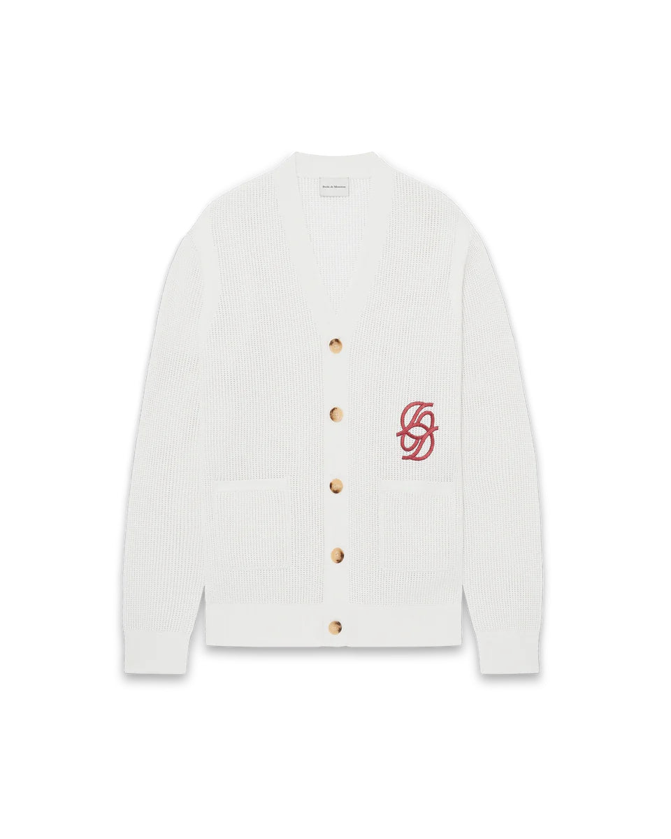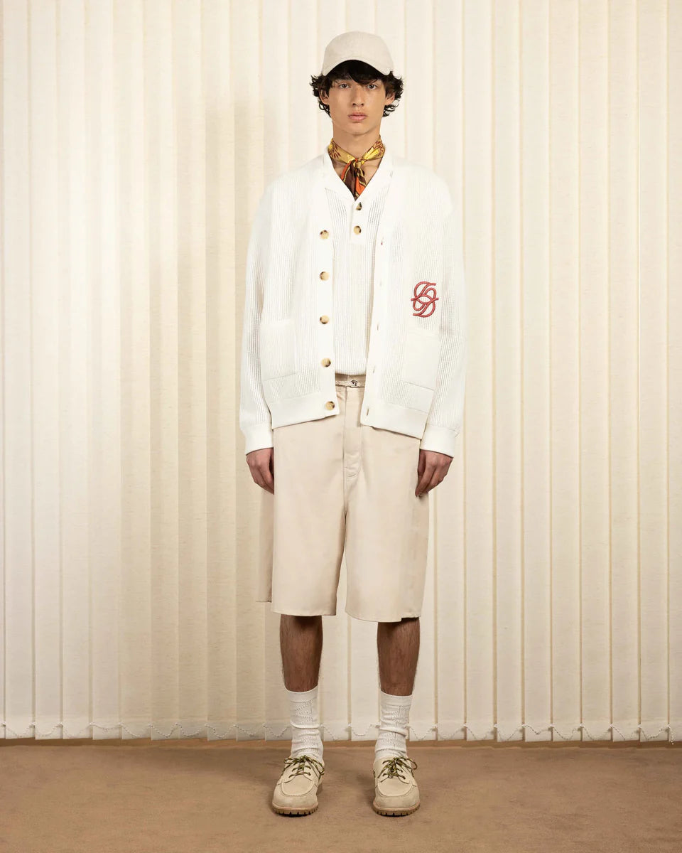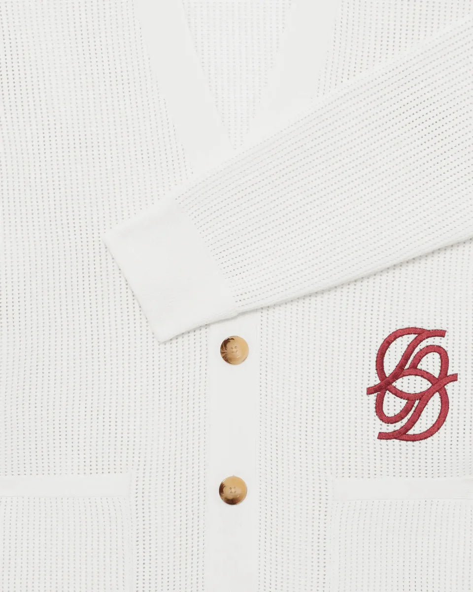 Diese cremefarbene, langärmelige Strickjacke aus 100 % Baumwolle ist mit einer „D“-Spiegelstickerei auf der Brust versehen. Sie hat einen V-Ausschnitt, niedrige Armlöcher, eine normale Passform, zwei aufgesetzte Taschen, gerippte Abschlüsse und fünf Knöpfe vorne.