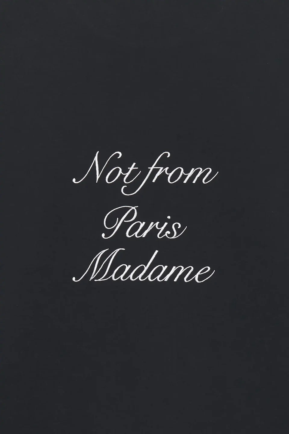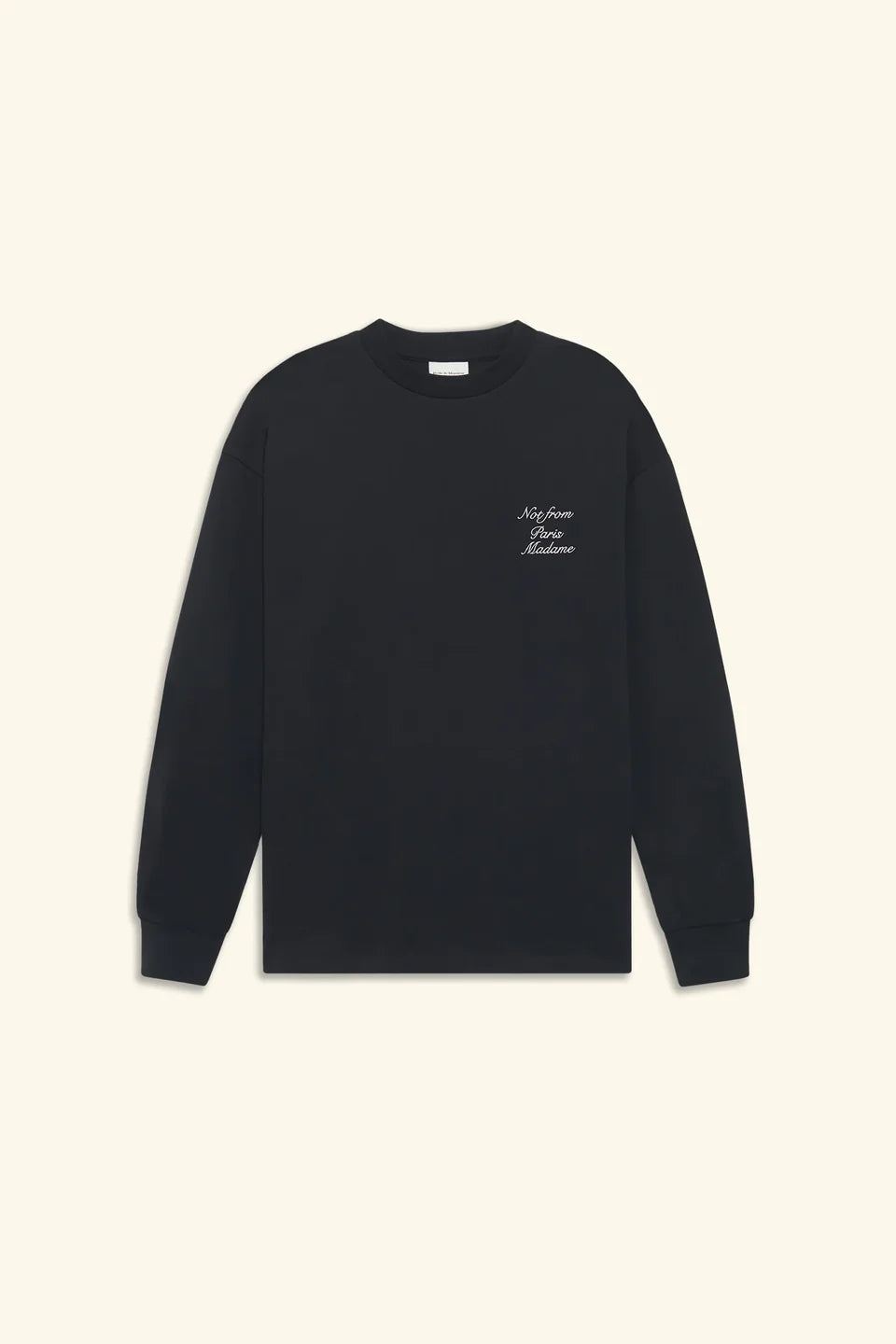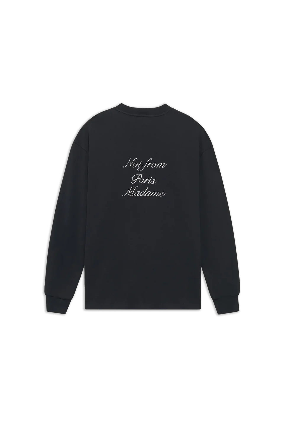 Dieses schwarze Interlock-T-Shirt aus 100 % Baumwolle trägt den Slogan „Not from Paris Madame“ in Kalligraphie auf der Vorder- und Rückseite. Es hat lange Ärmel und einen gerippten Halsausschnitt.