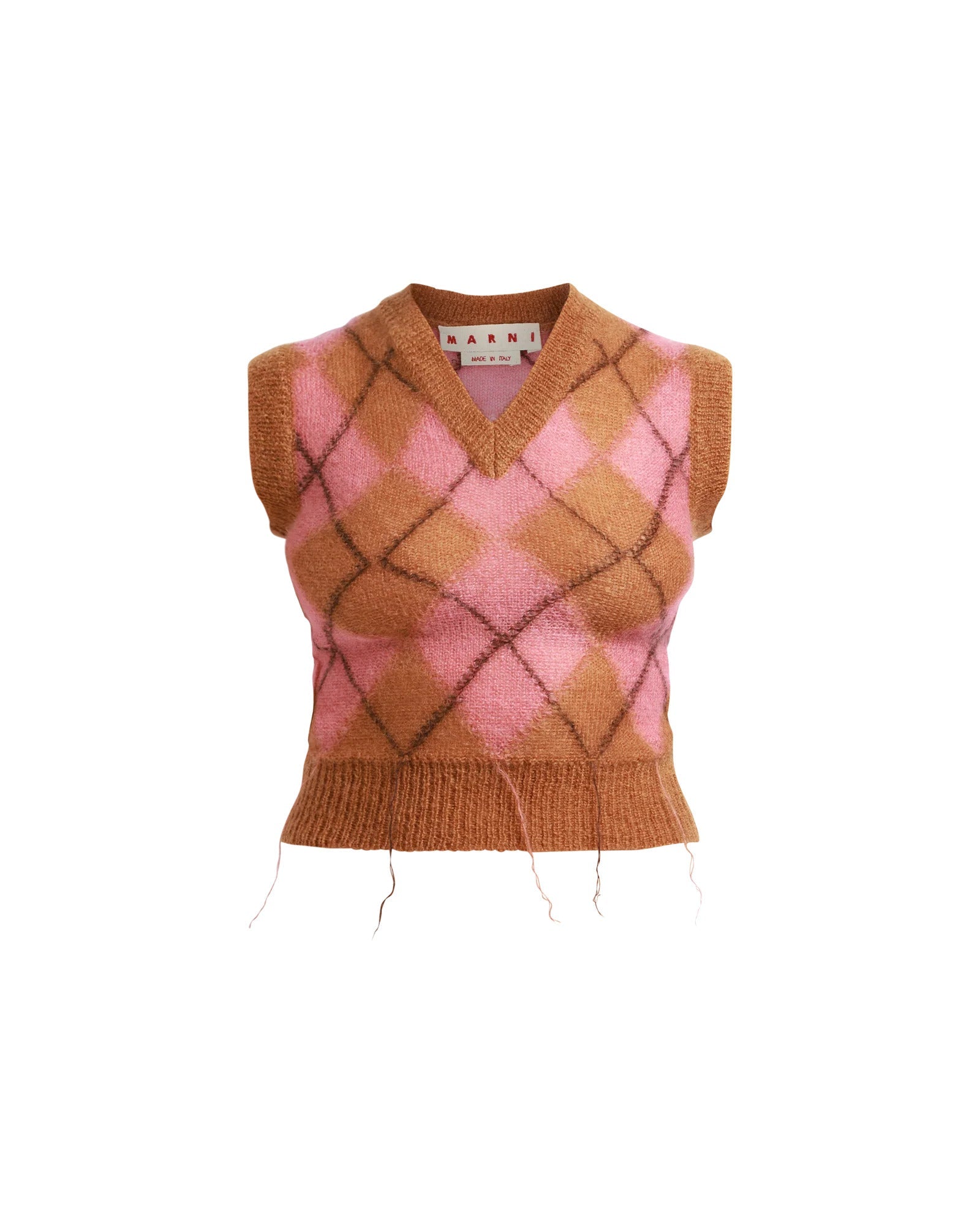 Eine ärmellose Weste aus einer leichten Mohair-Wollmischung. Sie hat eine schmale Passform mit geripptem V-Ausschnitt, fließende Fäden am unteren Rand und einen verkürzten Saum.