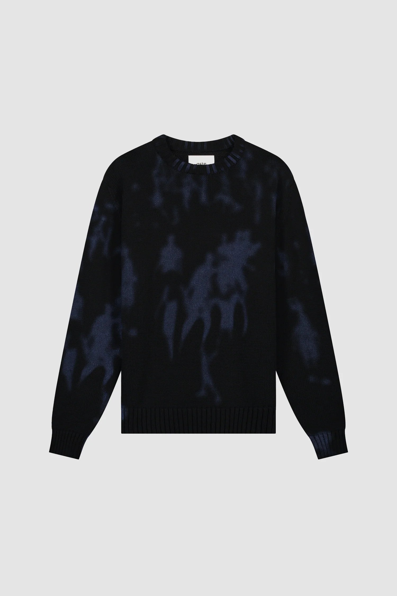 Der Strickpullover aus schwerer Baumwolle hat eine reguläre Passform und ist in schwarz-navy gehalten. Der Pullover ist mit einem saisonalen abstrakten Grafikdruck versehen.