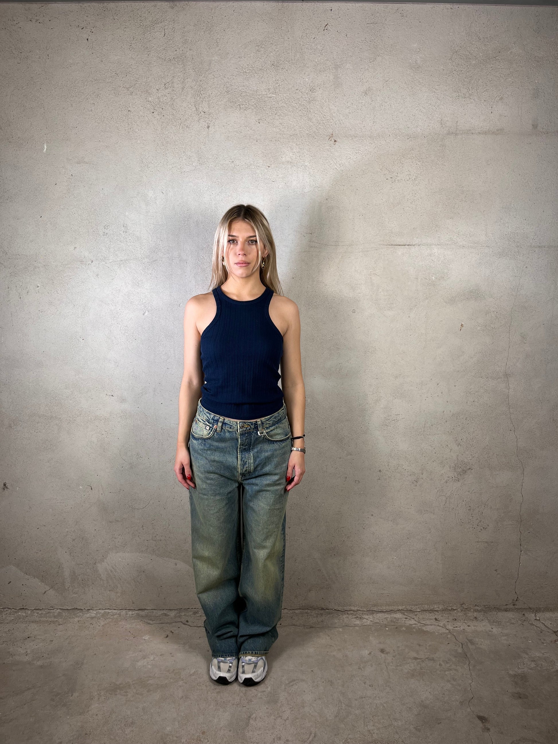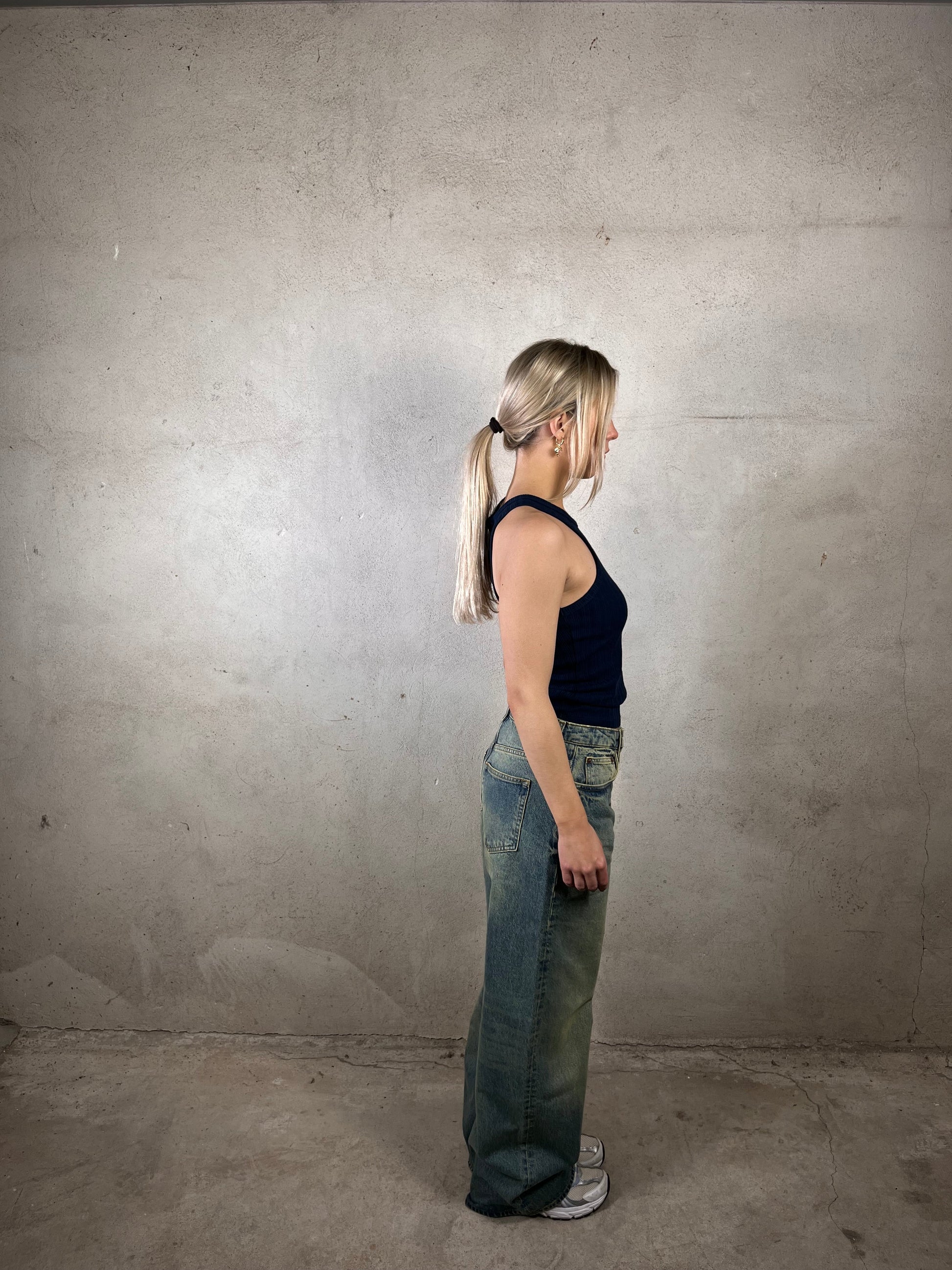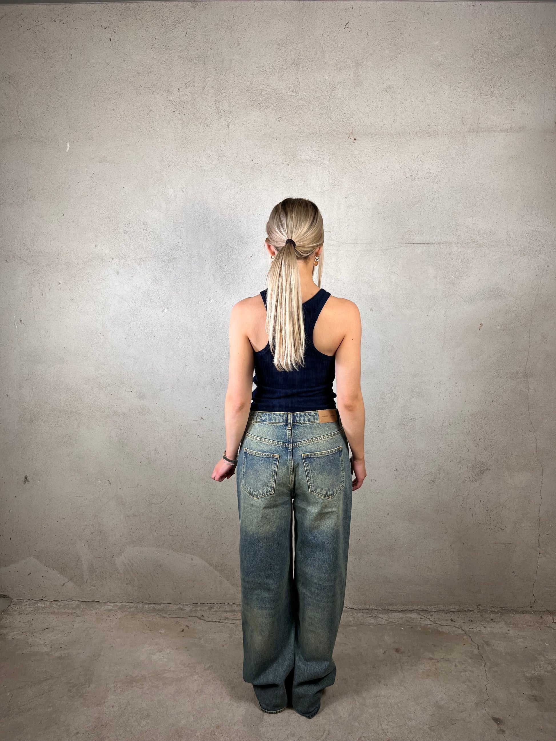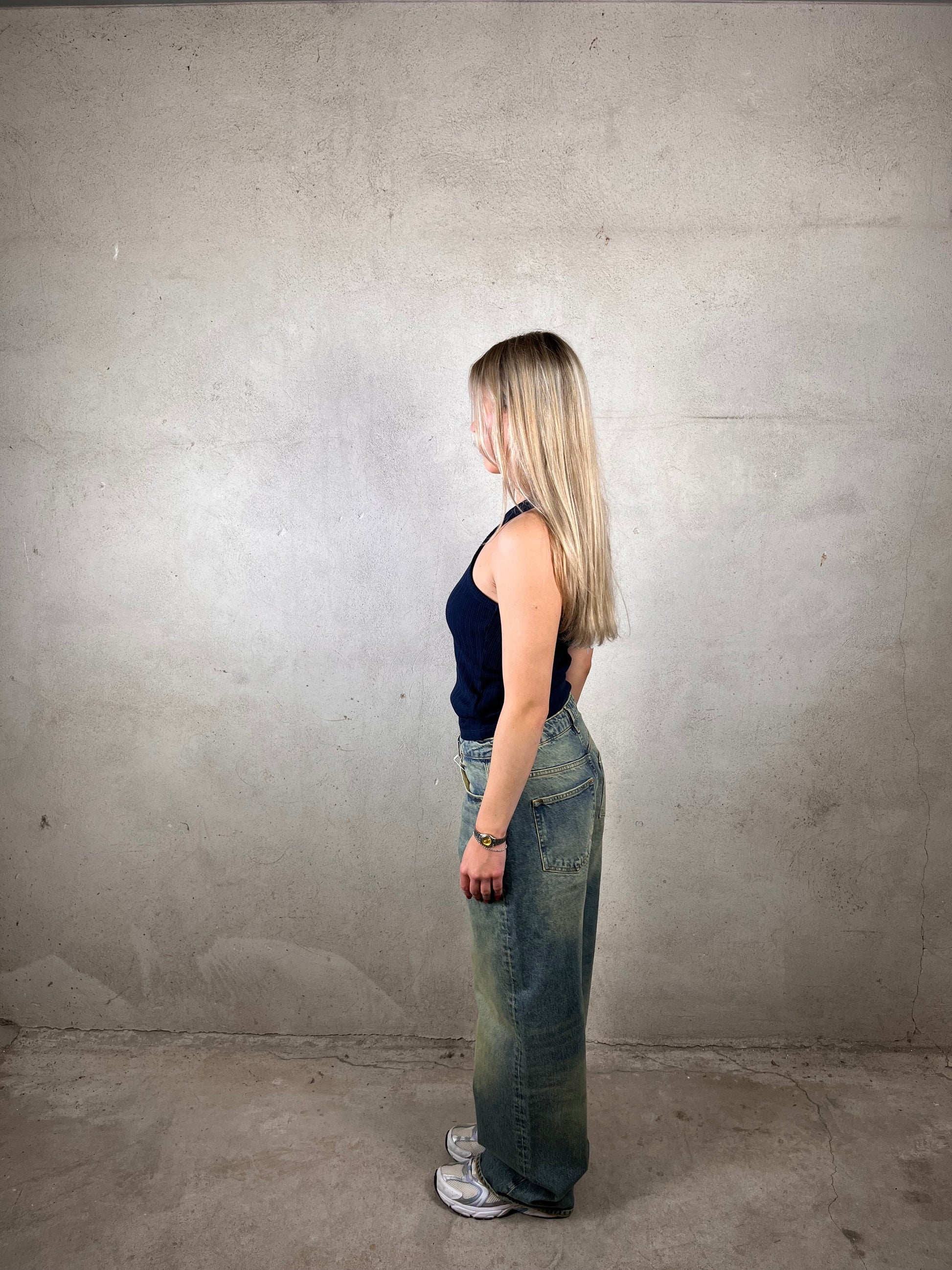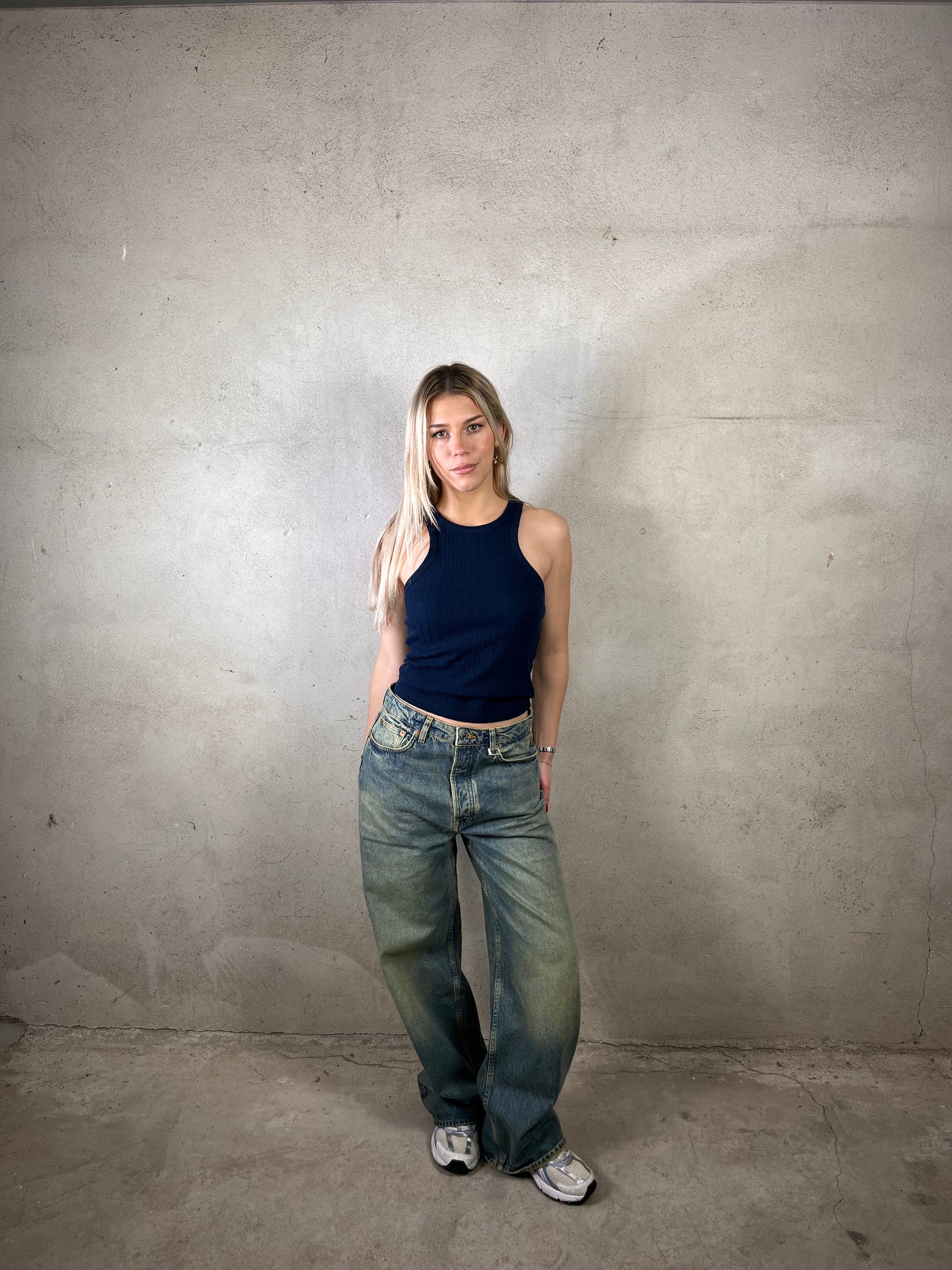 Jeans mit niedriger Taille, legerer Passform und weitem Bein. Mit Knopf und Reißverschluss. Fünf-Taschen-Stil. Gürtelschlaufen. Das Hauptmaterial besteht aus 100 % Bio-Baumwolle.