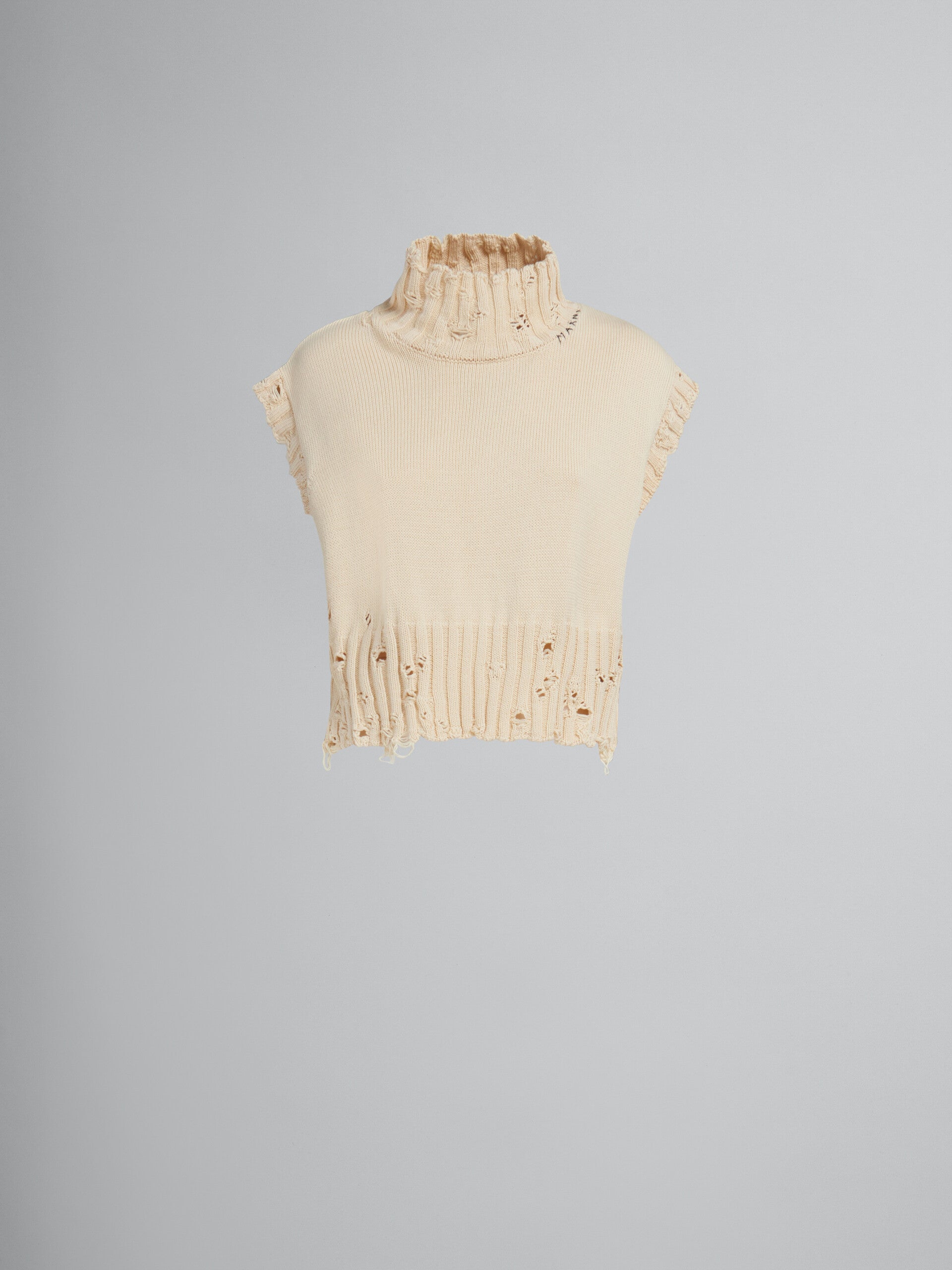 Gekürzte Weste mit Rollkragen. Weite Passform. Handgesticktes Logo auf der Vorderseite. In Italien hergestellt
