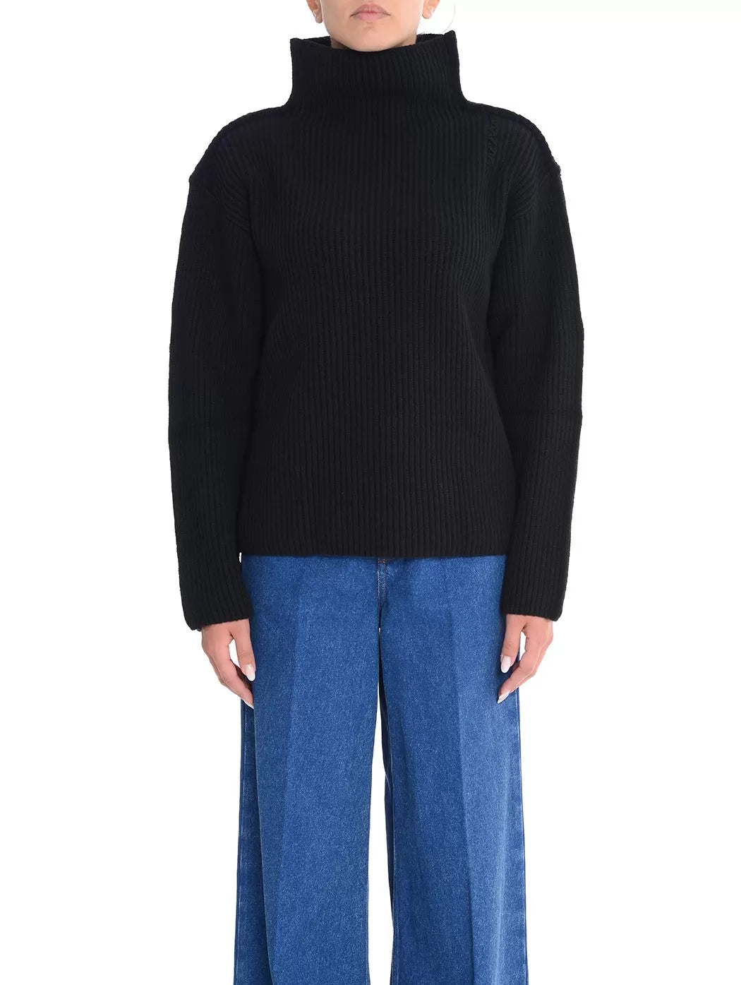 Hochgeschlossener Wollpullover von Marni mit Rippenstrick, Außennähten an beiden Seiten, überschnittenen Schultern, Ärmeln und gesticktem Logo auf der Vorderseite. Zusammensetzung: 100% Schurwolle. In Italien hergestellt.