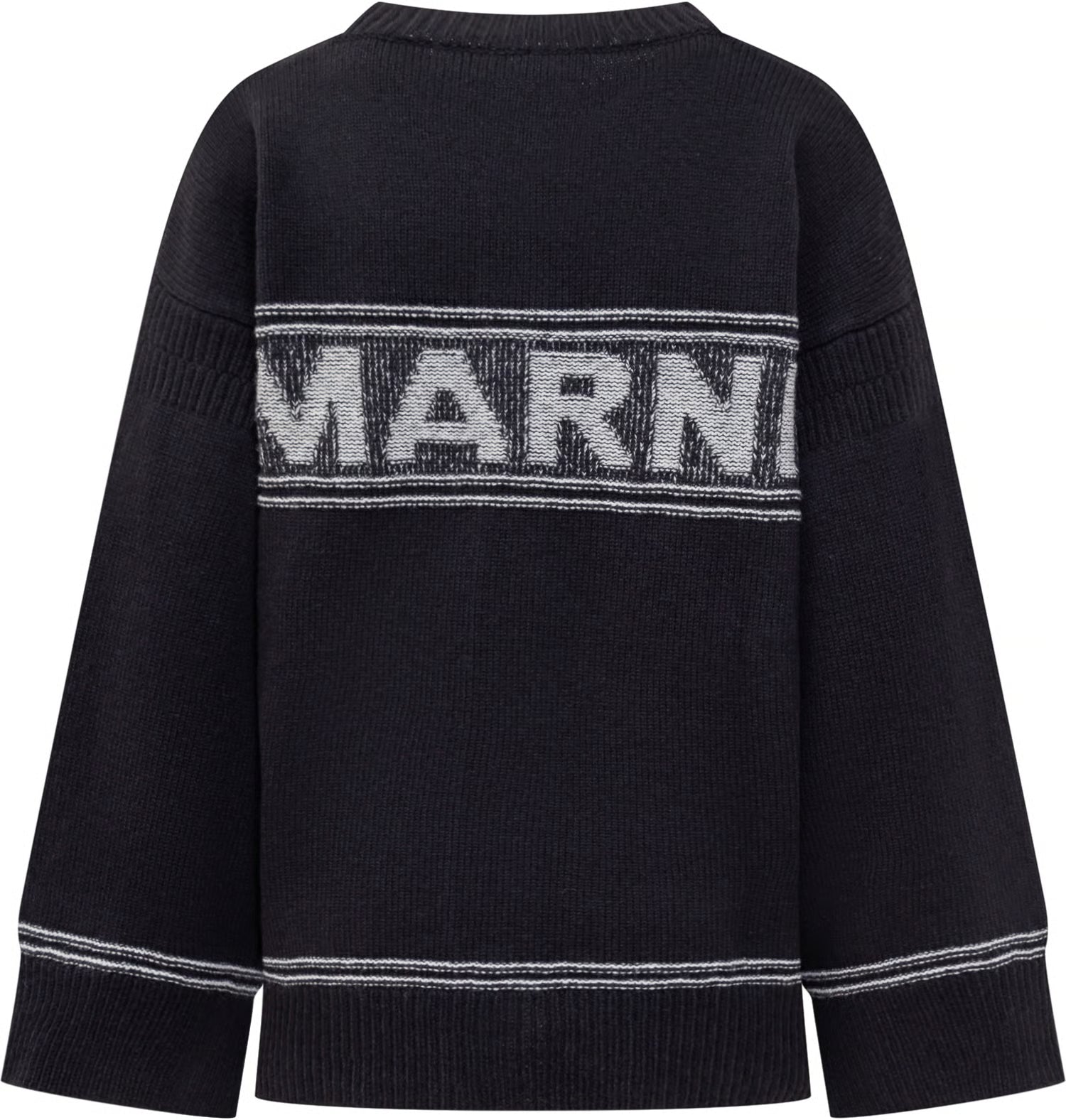 Wollcardigan, Rundhalsausschnitt, Knopfverschluss vorne, Intarsien hinten mit kontrastfarbenem Logo, seitliche Schlitze, lange Ärmel mit Bündchen und Kontrastnähte.
