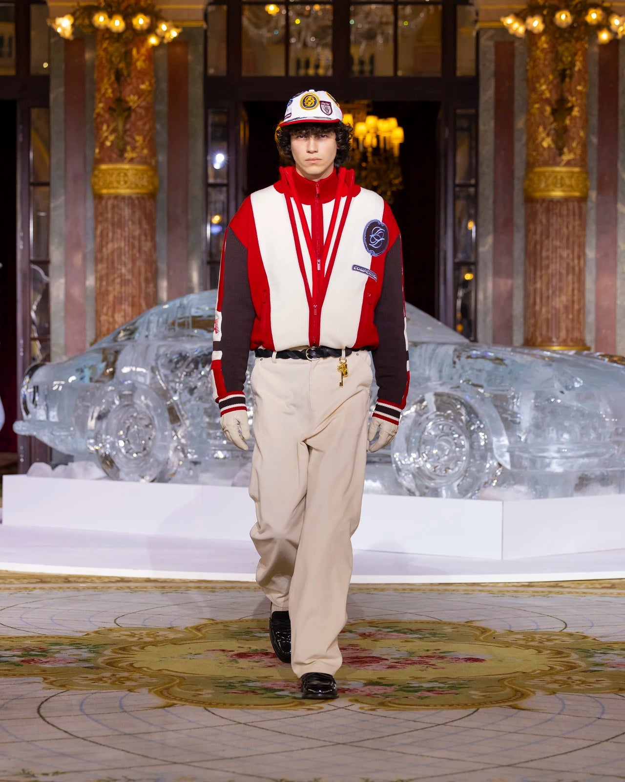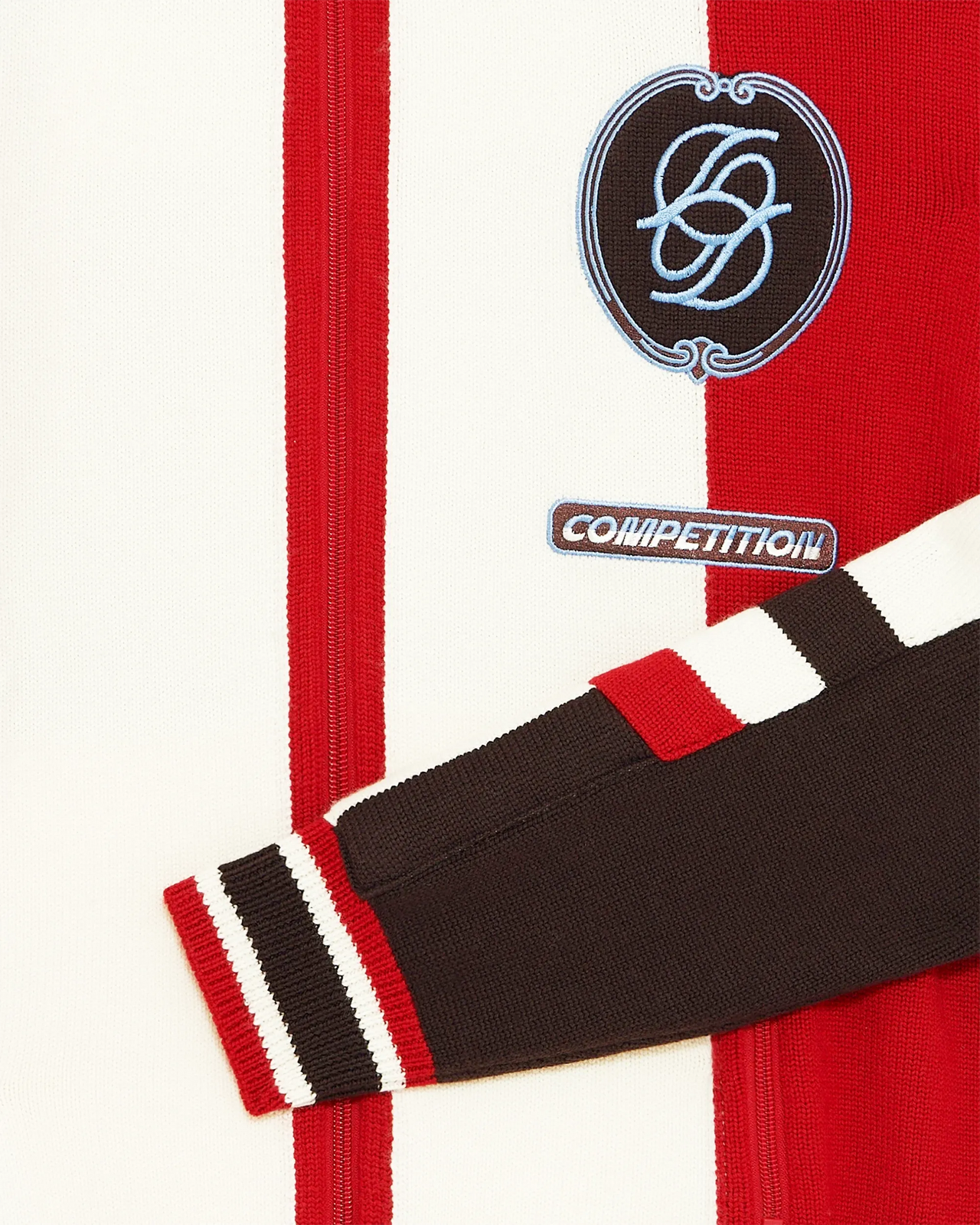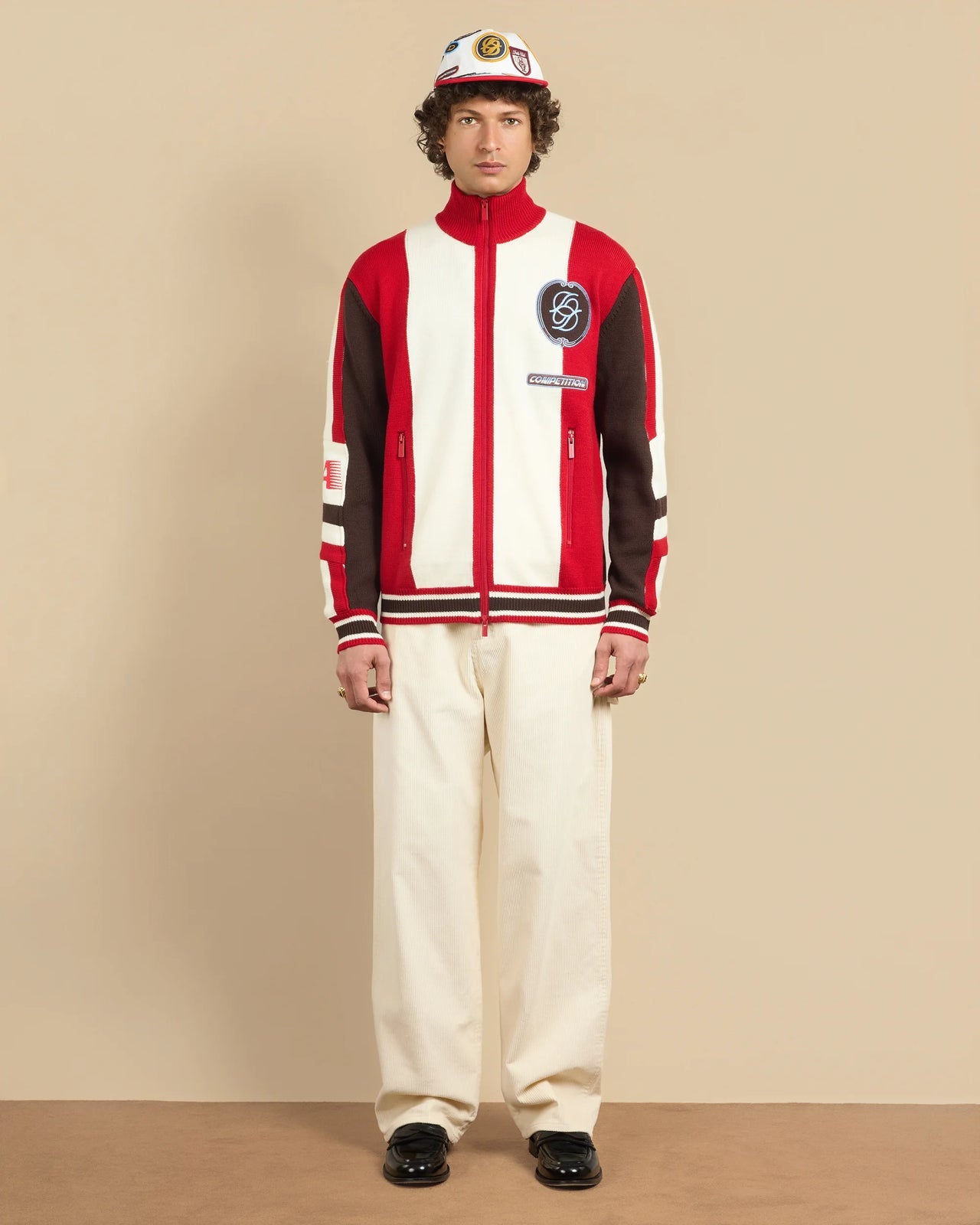Sie verfügt über einen Stehkragen, niedrige Armöffnungen, gestreifte Einsätze auf der Vorderseite, dreifarbige Streifen an den Ärmeln, spiegelverkehrte „D“- und Ski-Competition-Strickapplikationen auf der Brust sowie ein Jacquard-Strickpatch mit dem Drôle Club Slogan auf dem Rücken.