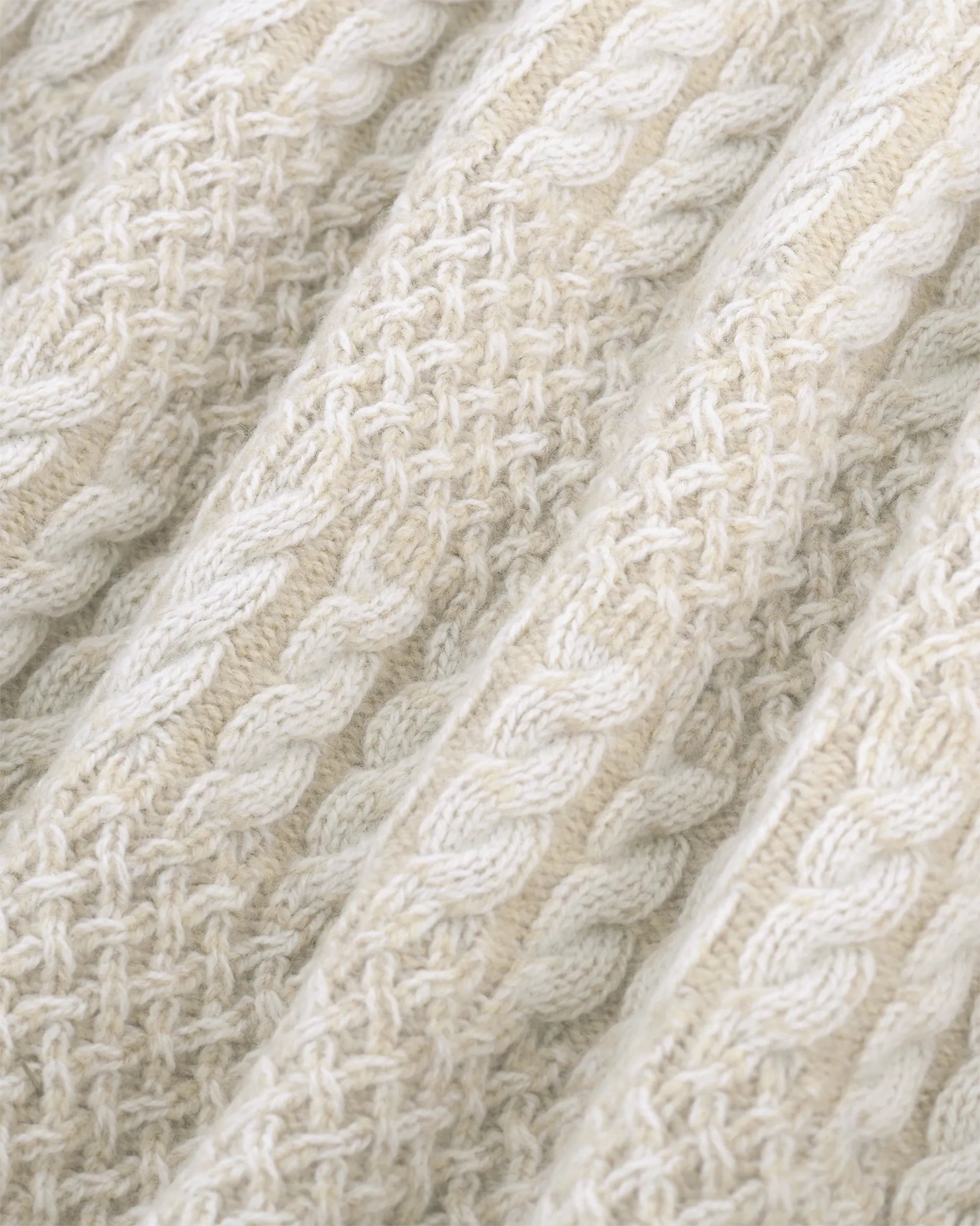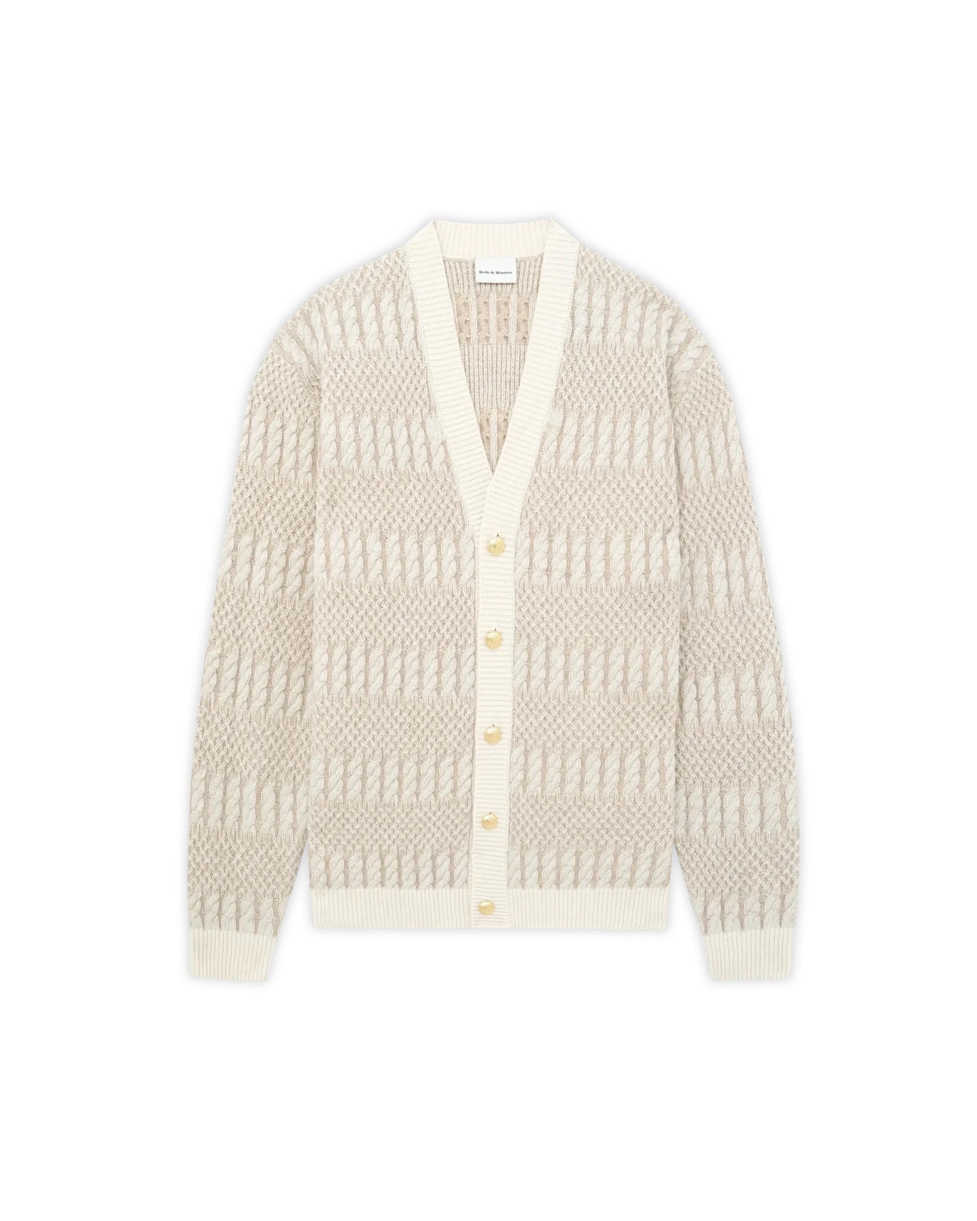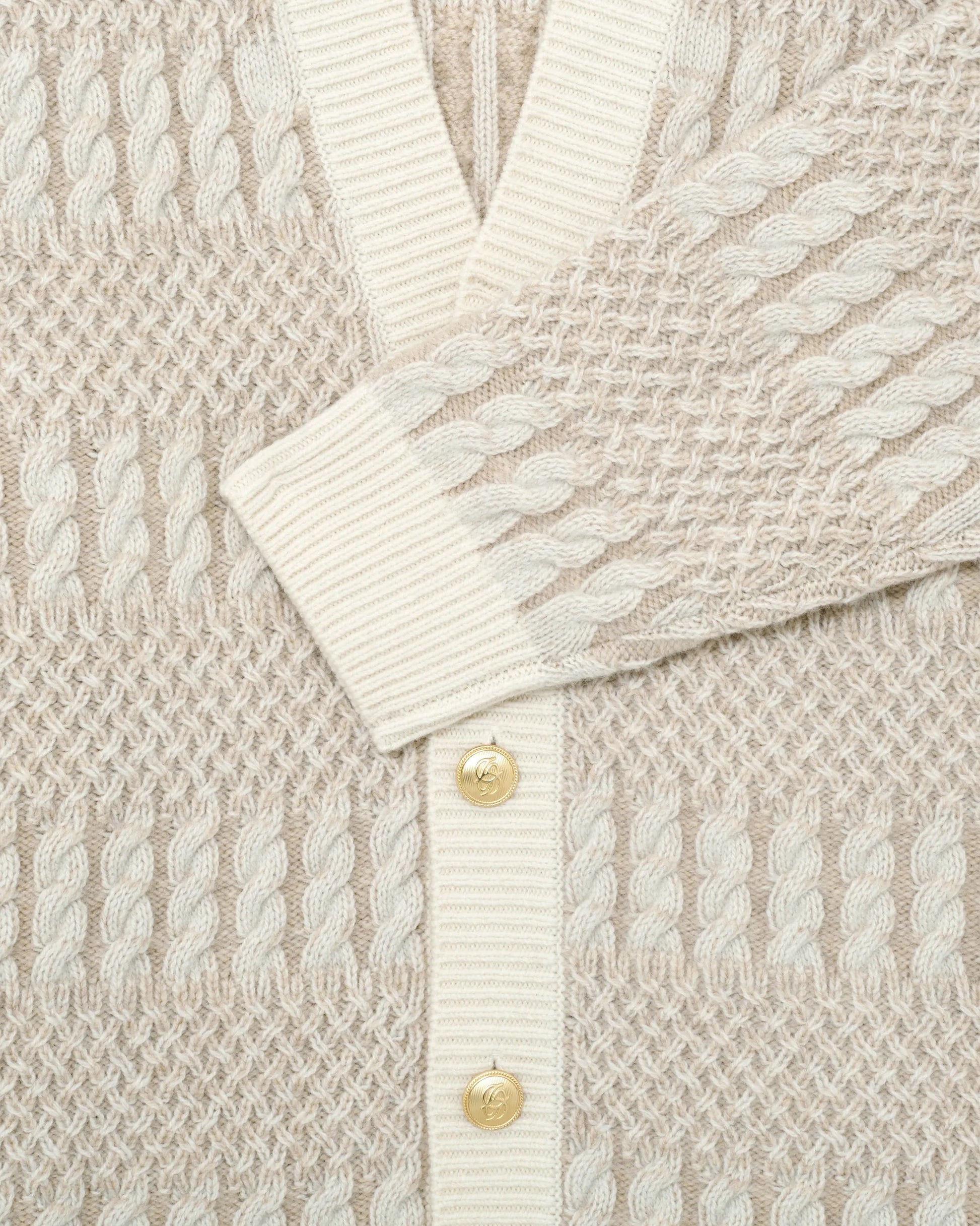 Die Drôle de Monsieur Strickjacke aus 100% Wolle ist mit einem kunstvollen Torsades-Muster versehen. Sie hat eine lockere Passform mit V-Ausschnitt, Knopfleiste und langen Ärmeln. Kontrastierende Rippabschlüsse runden das Design ab.