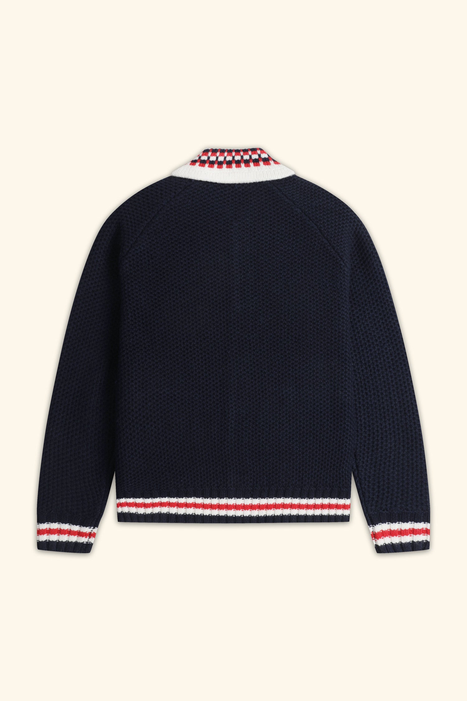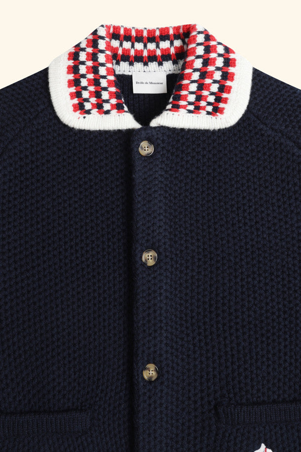 Die Drôle de Monsieur Le Gilet Emblème Chevaux in Navy ist aus einem hochwertigen Strickmaterial gefertigt und vereint Wärme und Atmungsaktivität in perfekter Balance. Die strukturierte Strickart verleiht dem Modell eine zeitlose Vielseitigkeit, ideal für lässige Layering-Looks ebenso wie für gehobene Outfits.