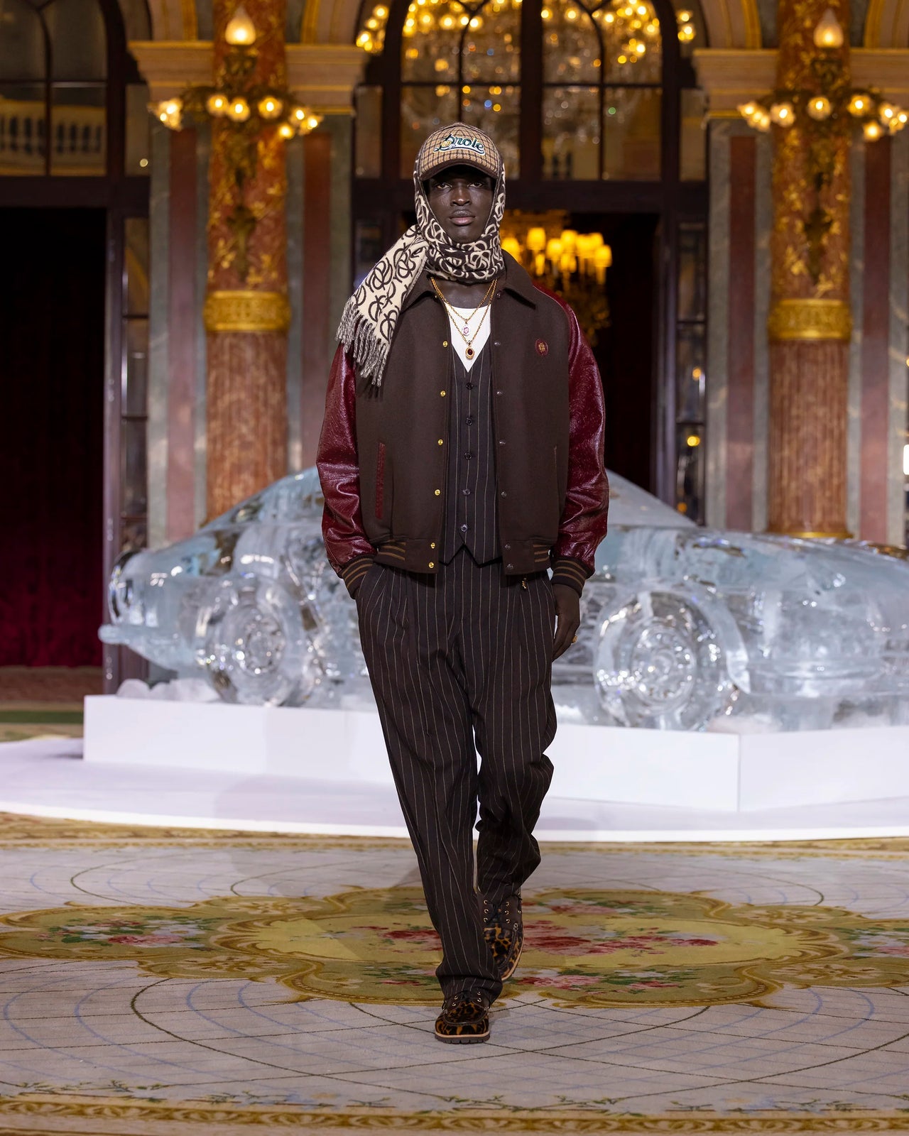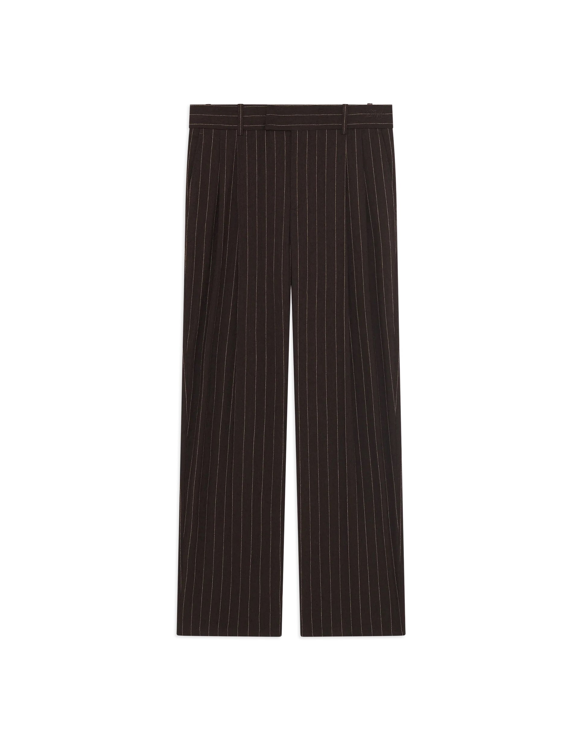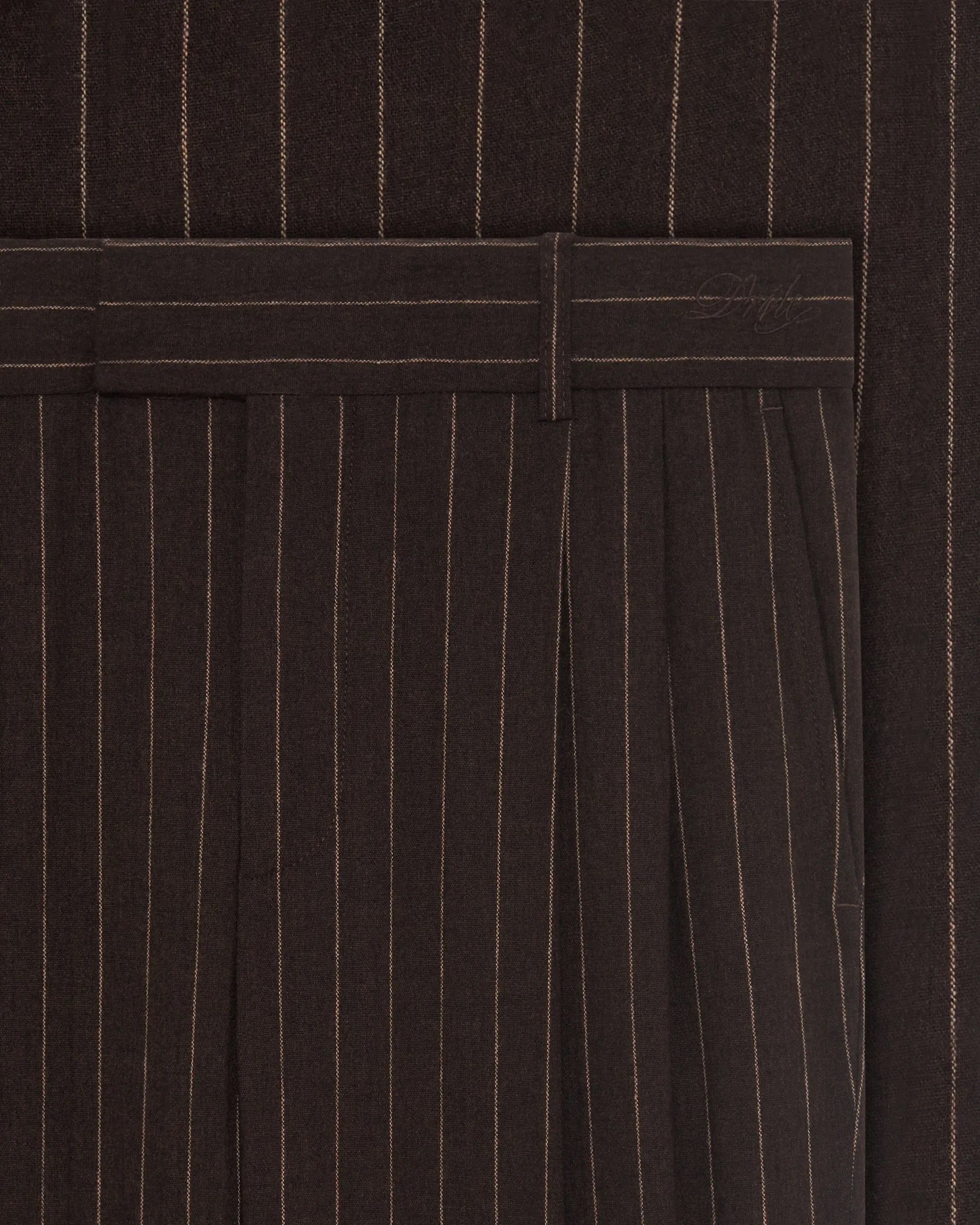Diese dunkelbraune, gestreifte Hose aus einer Wollmischung mit zwei Bundfalten verfügt über zwei italienische Taschen, zwei paspelierte Gesäßtaschen, individuell gestaltete Gürtelschlaufen sowie einen Reiß- und Hakenverschluss. Auf der Rückseite befindet sich eine „Drôle“-Stickerei.