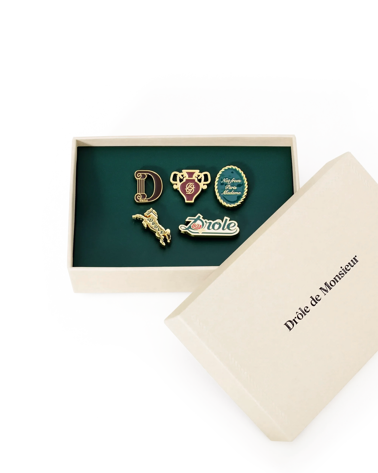 Dieses Set besteht aus fünf goldfarbenen Racing-Pins aus 100 % Zamak in den Designs Cheval, Drôle Rose, D, Coupe und Slogan.