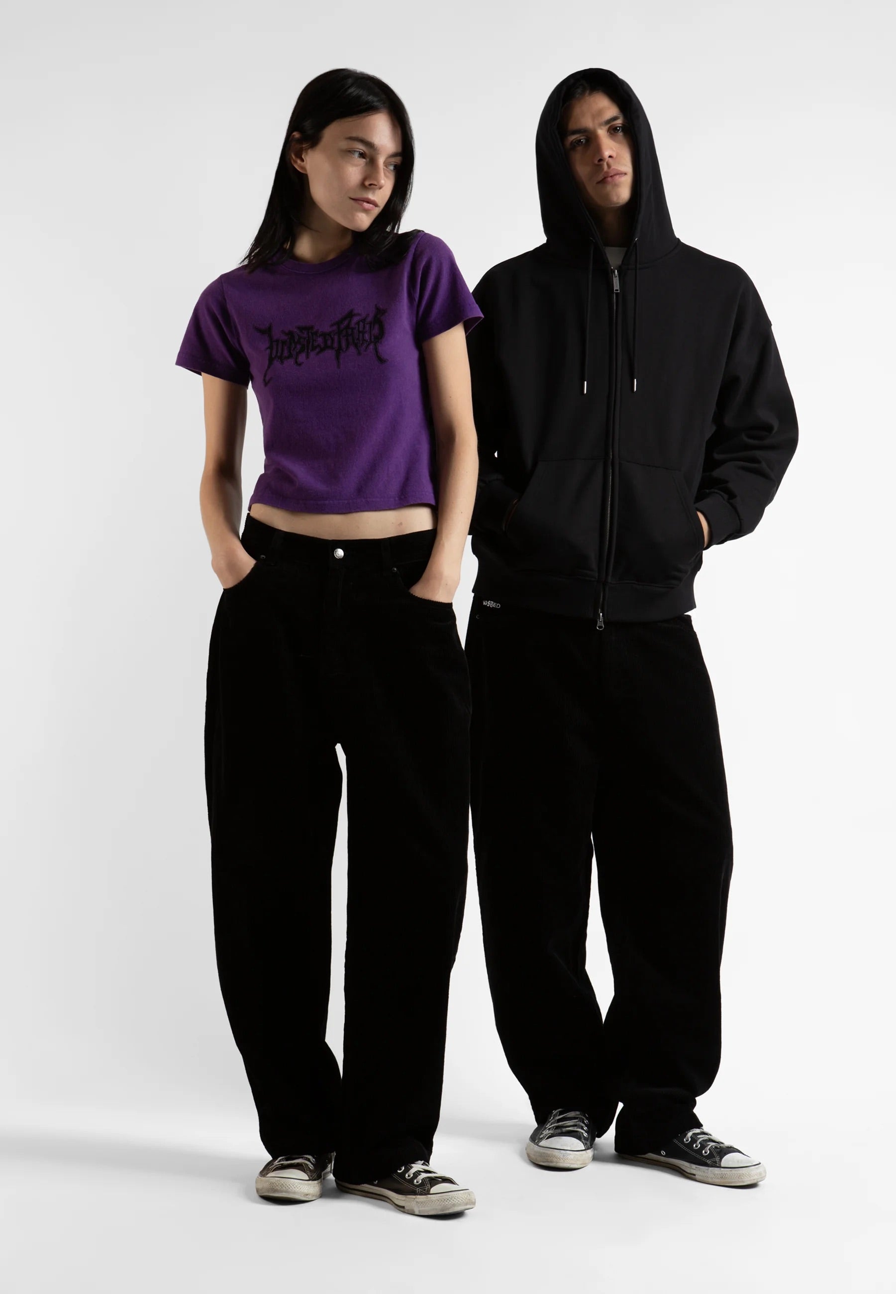 The Casper Acid pants is made from thick cotton velvet. Baggy cut, pockets and faux leather label at the back. It features the embroidered Method logo on the front and the Sid logo on the back pocket.