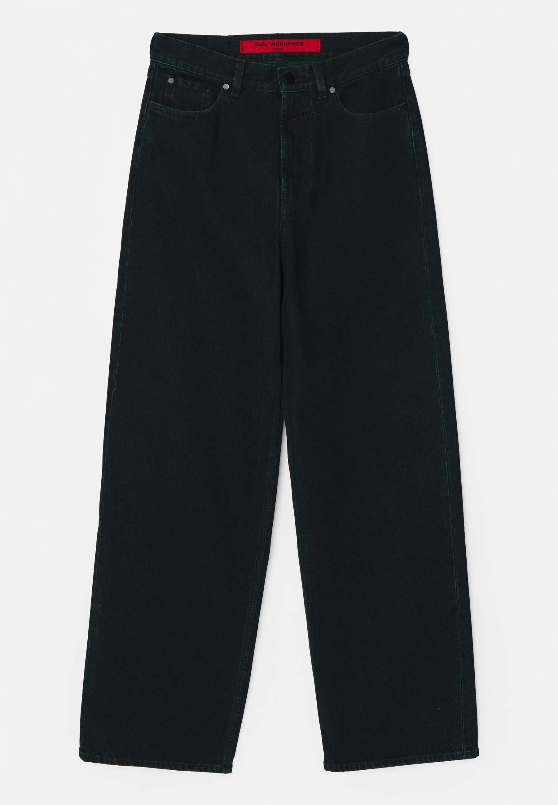 Übergroße, locker geschnittene Denim-Hose mit niedriger Leibhöhe und spezieller, gefärbter Moon-Wash-Behandlung. Dieses Modell mit 5 Taschen verfügt über eine tonale Logostickerei auf dem vorderen Hosenschlitz und einen 032c Raw Denim-Aufnäher als Hommage an das erste 032c-Ausgabecover auf dem hinteren Bund.