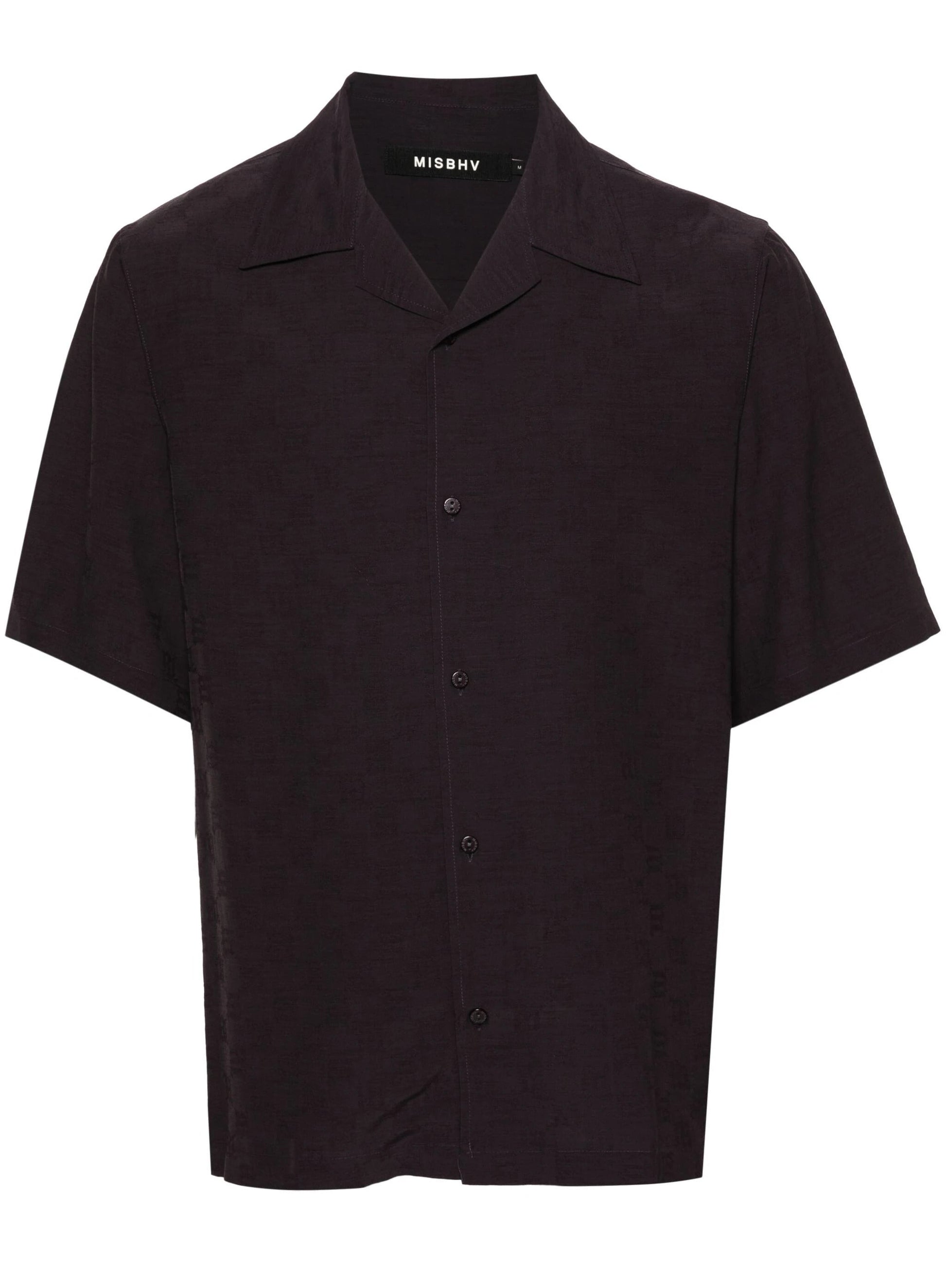 Kurzärmeliges Hemd in Beige mit Bowlingkragen. Es wurde aus weichem Stoff mit Zusatzwolle hergestellt. Es verfügt über ein durchgehendes Monogrammmuster.
